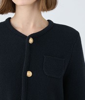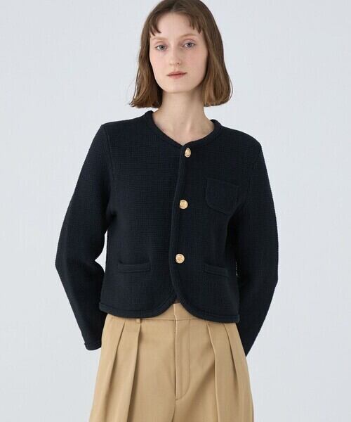 アンカーの金ボタンが印象的なニットジャケットは規則的な凹凸を持つモスステッチで、いわゆる鹿の子の一種の編み地が特徴的です。