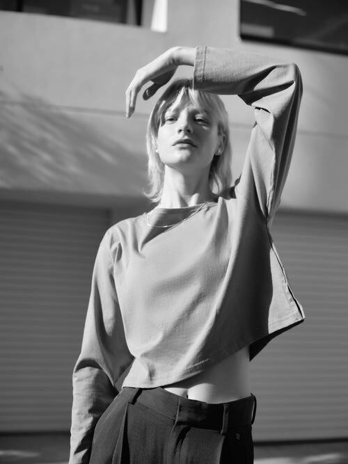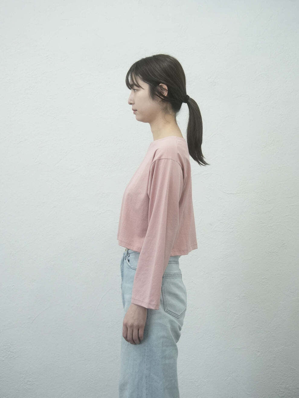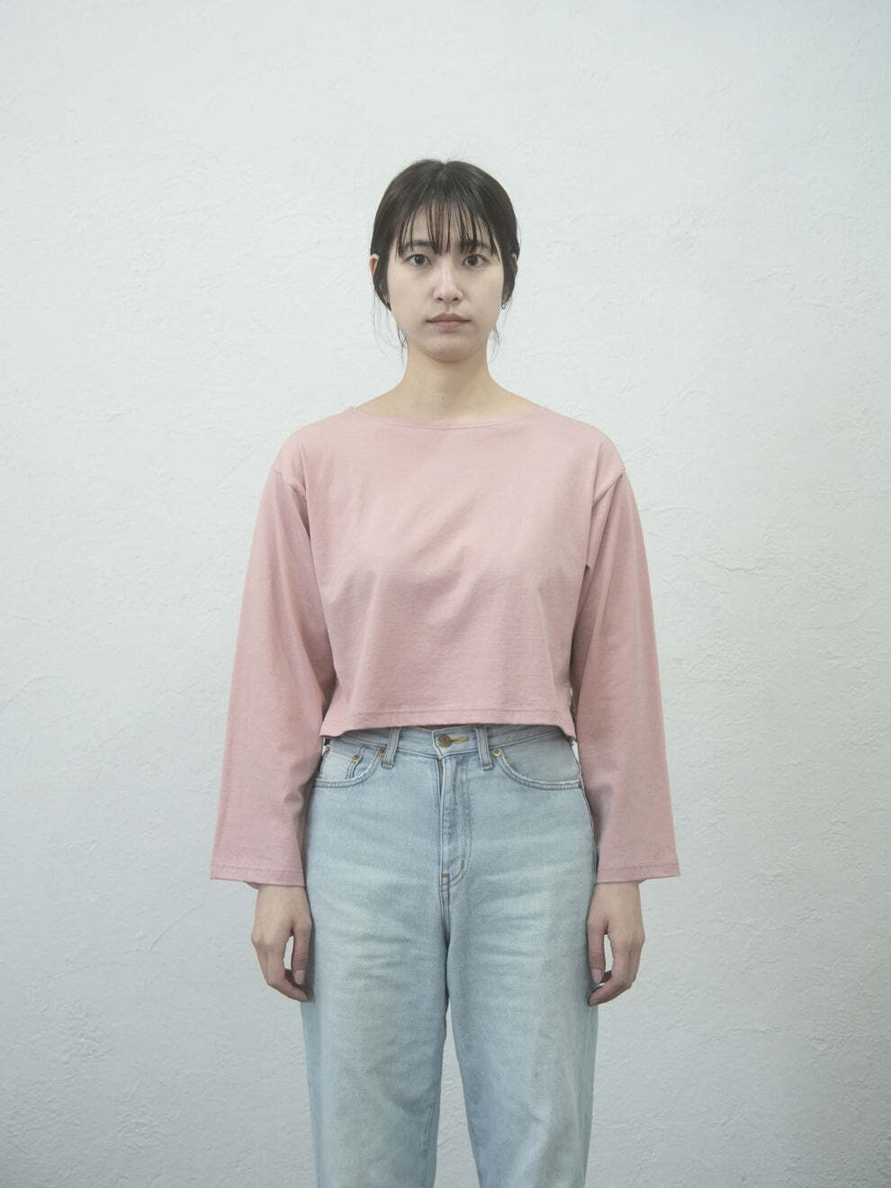 短めの着丈は、ハイウエストボトムスやワンピースとのレイヤードも楽しんでいただけます。