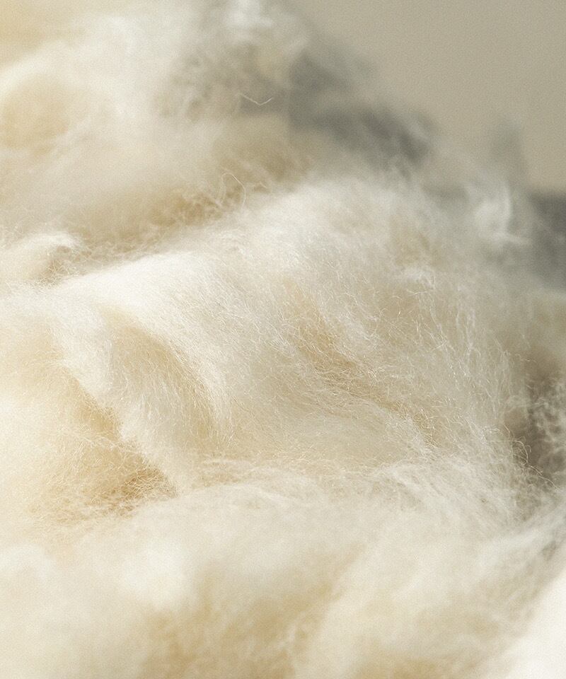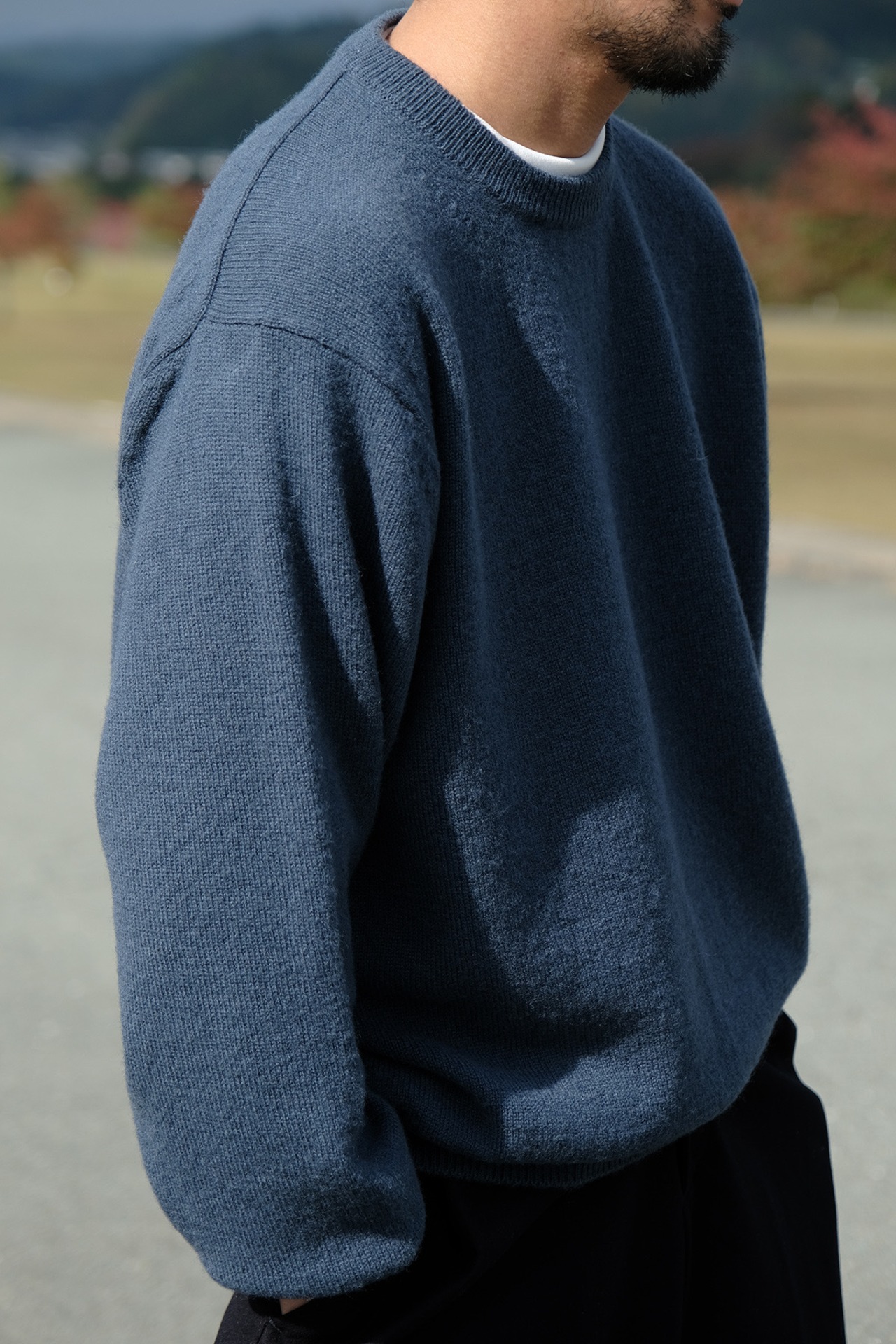 粗野な表情を持ちながらも、英国羊毛らしい弾力のあるふくらみと軽やかな着心地が魅力。