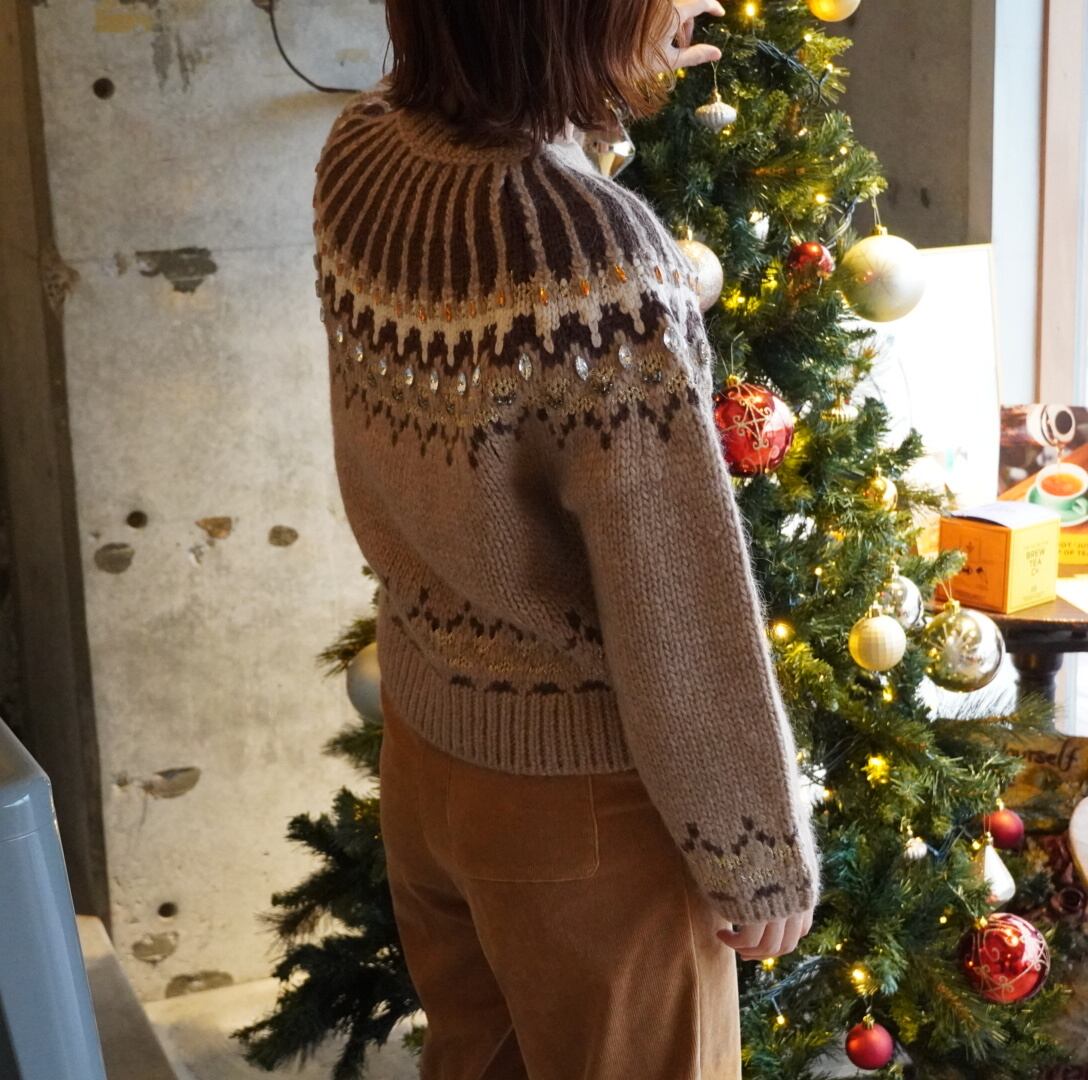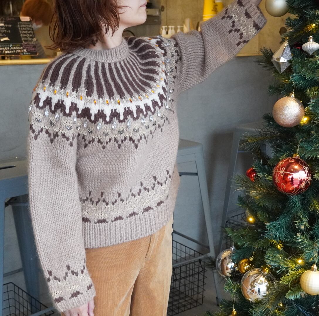 冬の定番柄、ノルディックの可愛さと特別感あるビジューが印象的なニット。