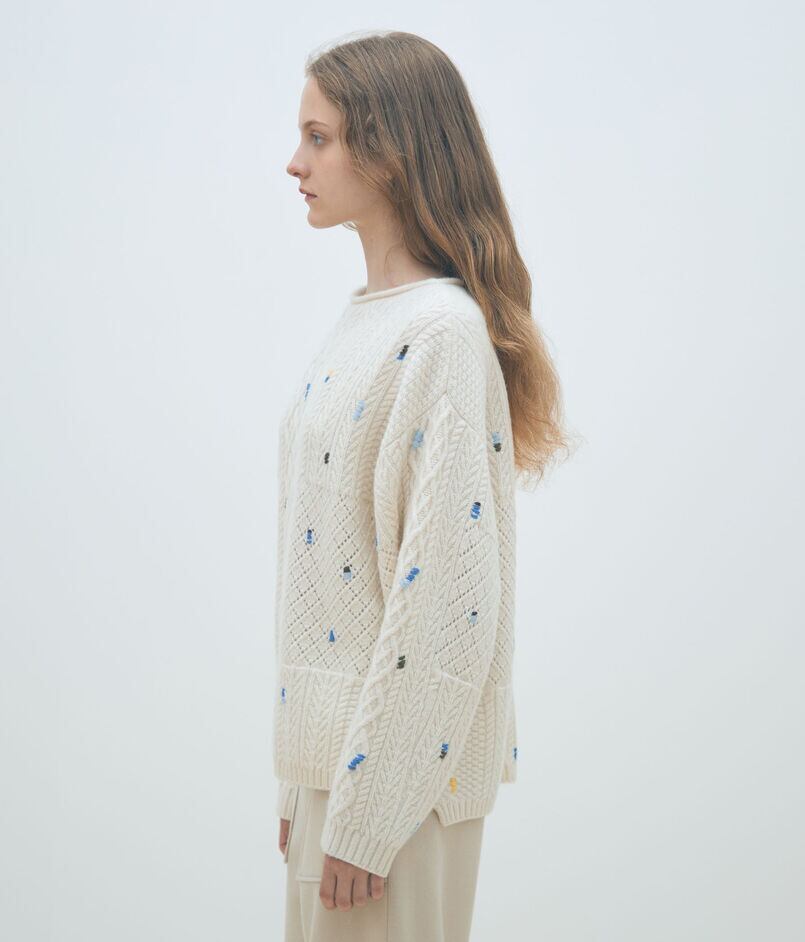 ベーシックなウールの糸でさまざまな柄を幾何学的に配置して編み上げたニットプルオーバー。