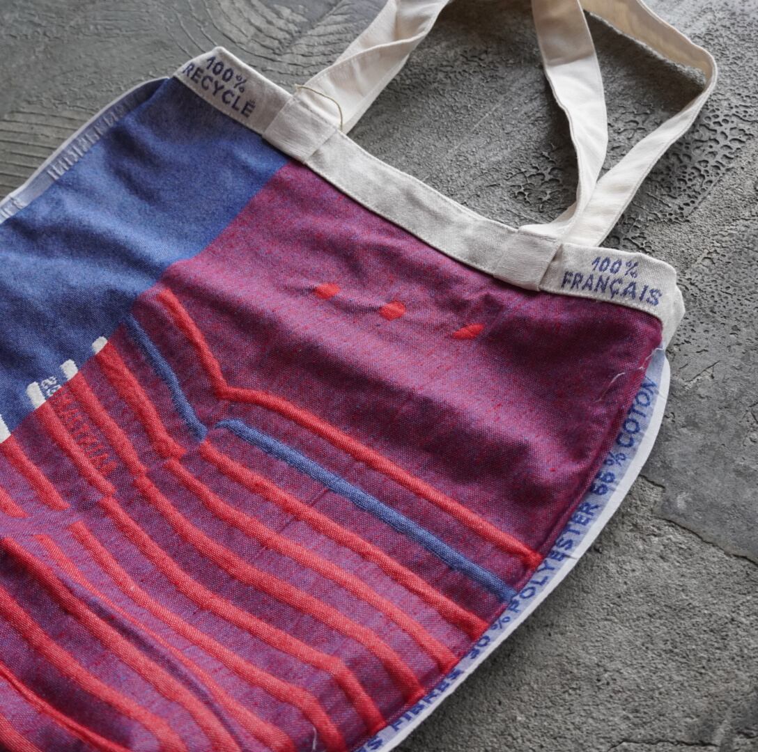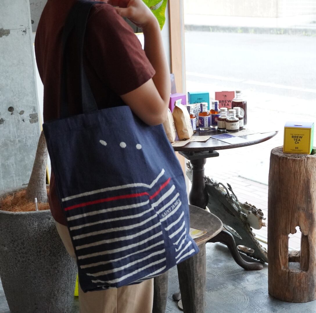 セントジェームスのトートバッグはプリントではなく刺繍で柄出ししております。裏地もPOPな感じ。